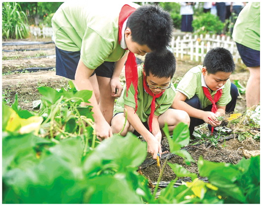 Le même jour, à la ferme du campus d'une école primaire située à Jiaxing, une ville de la province du Zhejiang (est de la Chine), les élèves ont participé à des cours de travail spéciaux tels que le ramassage des patates douces, le désherbage et l'arrosage pour commencer leur ? première le?on de la rentrée scolaire ?.