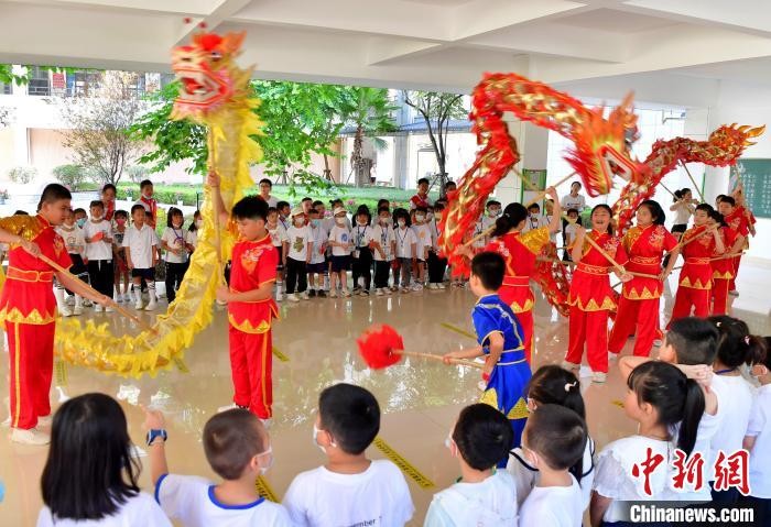 Des élèves des classes supérieures ont interprété la danse du dragon dans l'Ecole primaire de Gaohu de la ville de Fuzhou