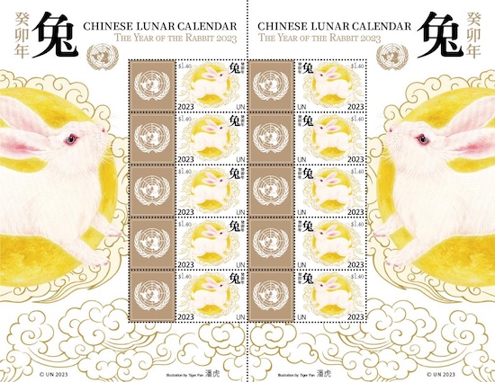 La planche de timbres, qui sera publiée le 20 janvier selon le programme de l'APNU, se compose de dix timbres d'une valeur de 1,40 dollar américain chacun, avec un lapin blanc de style gongbi (peinture méticuleuse) sur fond de lune dorée entourée de nuages, l'année lunaire chinoise de 2023 étant l'Année du Lapin.