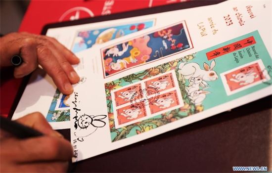 L'artiste chinois, Chen Jianghong, qui a con?u deux blocs de timbres émis par la Poste de France pour cérébrer le Nouvel An lunaire chinois, dédicace sa création de timbres consacrés à "l'année du Lapin", lors d'une cérémonie organisée à Paris, en France, le 14 janvier 2023. Cette année, la Poste de France célèbre le Nouvel An du calendrier lunaire chinois avec l'édition de deux blocs de cinq timbres consacrés à "l'année du Lapin". (Xinhua/Gao Jing)