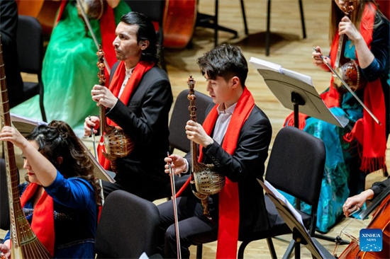 Photo prise le 14 janvier 2023 montrant le concert du Nouvel An lunaire chinois présenté par l'orchestre folklorique du Théatre d'art du Xinjiang à Urumqi, capitale de la région autonome ou?ghoure du Xinjiang (nord-ouest de la Chine). (Xinhua)