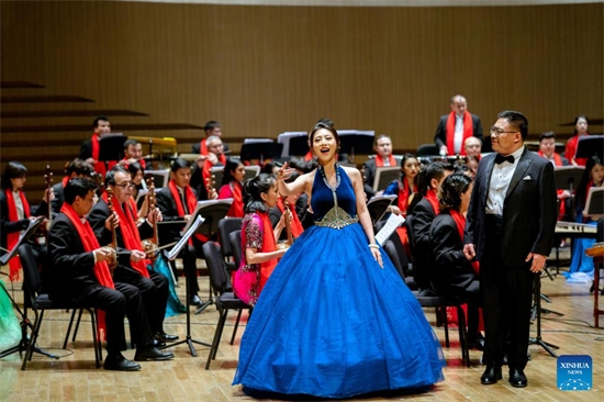 Cette photo prise le 14 janvier 2023 montrant le concert du Nouvel An lunaire chinois présenté par l'orchestre folklorique du Théatre d'art du Xinjiang à Urumqi, capitale de la région autonome ou?ghoure du Xinjiang (nord-ouest de la Chine). (Xinhua)