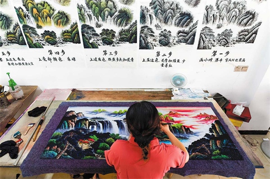 à l'heure actuelle, il y a 460 agriculteurs-peintres et 6 ateliers. Leurs peintures sont vendues dans plus de 10 pays, dont Singapour et l'Espagne, avec un chiffre d'affaires atteignant 20 millions de yuans, ce qui a aidé 42 ménages pauvres enregistrés à sortir de la pauvreté.