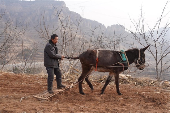 Un agriculteur du comté de Shexian, dans la province du Hebei (nord de la Chine) nivelle le sol avec l'aide de son ane, le 28 février. Les anes jouent un r?le vital dans le système agricole de montagne du comté, vieux de 700 ans. (Wang Haoran / China Daily)