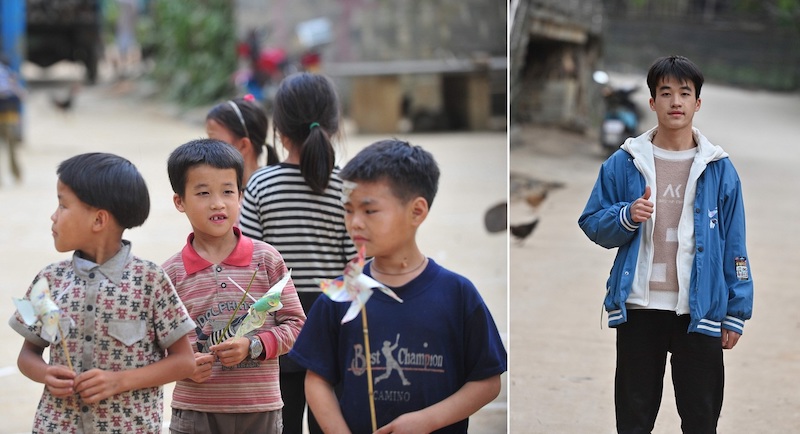 Photo combinée montrant Meng Wangbing, 7 ans (2e à gauche) jouant avec des amis à l'école le 4 juillet 2012 (à gauche) et Meng Wangbing, étudiant de première année à l'Université de technologie de Guilin, posant pour une photo le 25 janvier. 2023 (à droite) dans le village de Nongyong du comté autonome Yao de Dahua, dans la région autonome Zhuang du Guangxi (sud de la Chine). (Photo / Xinhua)