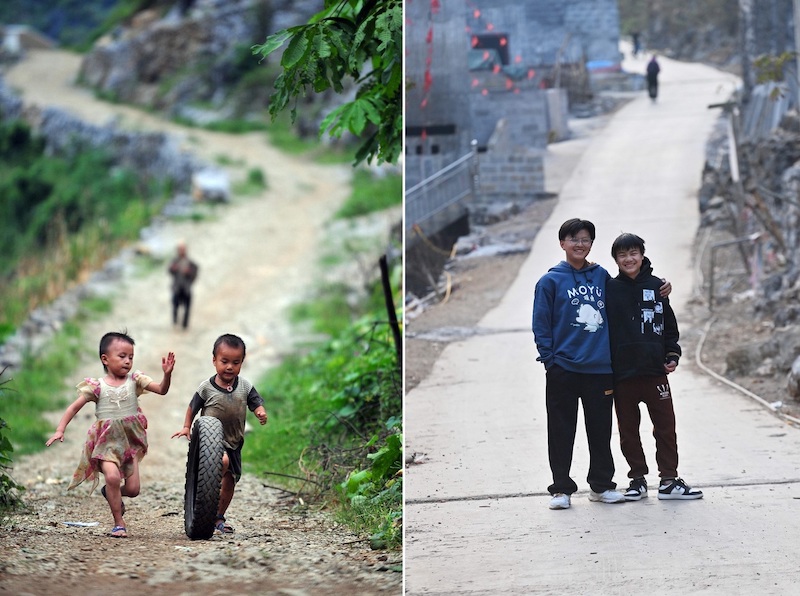 Photo combinée montrant Meng Xuanhong, 4 ans, dans la vieille robe de sa s?ur jouant avec Lan Xiaoshuai le 16 juillet 2012 (à gauche) et les collégiens Meng Xuanhong et Lan Xiaoshuai posant pour une photo le 21 janvier 2023 (à droite) dans le village de Nongyong du comté autonome Yao de Dahua, dans la région autonome Zhuang du Guangxi (sud de la Chine). (Photo / Xinhua)