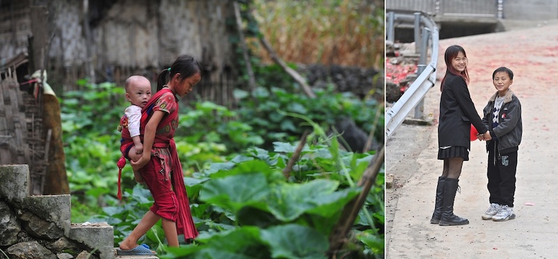 Photo combinée montrant Meng Rouyu, 10 ans, marchant avec son petit frère Meng Xuanpeng sur le dos le 16 juillet 2012 (à gauche) et Meng Rouyu, dipl?mée d'une école pour enseignants de maternelle, posant pour une photo avec son petit frère Meng Xuanpeng le 20 janvier 2023 (à droite) dans le village de Nongyong du comté autonome Yao de Dahua, dans la région autonome Zhuang du Guangxi (sud de la Chine). (Photo / Xinhua)