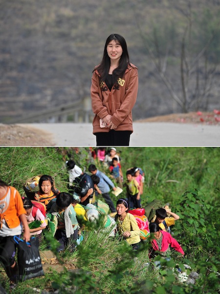 Photo combinée montrant Lan Qiuyan, qui vient d'obtenir son dipl?me d'université, posant pour une photo lors de son retour chez elle pour la Fête du printemps le 21 janvier 2023 (ci-dessus) et Lan Qiuyan, 11 ans, vêtue d'un maillot jaune, marchant en direction de son domicile sur une route de montagne depuis l'école le 4 juillet 2012 (ci-dessous) dans le village de Nongyong du comté autonome Yao de Dahua, dans la région autonome Zhuang du Guangxi (sud de la Chine). (Photo / Xinhua)