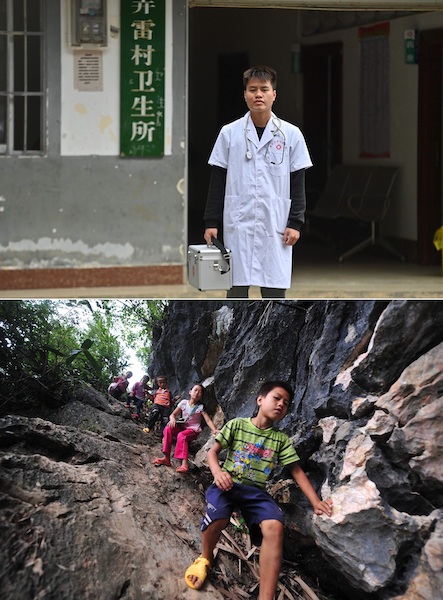Photo combinée montrant Meng Fusong, aujourd'hui médecin dans le village, posant pour une photo devant la clinique du village le 24 mai 2023 (ci-dessus) et Meng Fusong, 10 ans (1ère à droite) sur le chemin de l'école le 5 septembre 2012 (ci-dessous) dans le village de Nonglei du comté autonome Yao de Dahua, dans la région autonome Zhuang du Guangxi (sud de la Chine). (Photo / Xinhua)