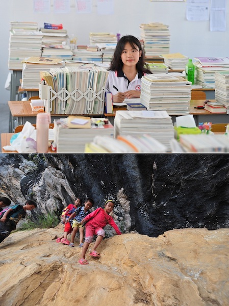 Photo combinée montrant Meng Ligu, élève du secondaire, posant pour une photo dans sa classe au siège du comté le 20 mai 2023 (ci-dessus) et Meng Ligu, 7 ans, en route pour l'école le 3 septembre. 2012 (ci-dessous) dans le village de Nonglei du comté autonome Yao de Dahua, dans la région autonome Zhuang du Guangxi (sud de la Chine). (Photo / Xinhua)