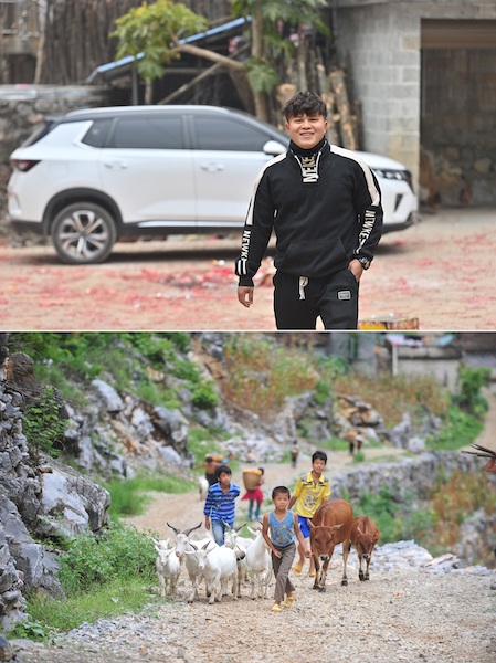 Photo combinée montrant Meng Xuanzhao, qui gagne sa vie dans la province voisine du Guangdong après avoir obtenu son dipl?me d'une école professionnelle, posant pour une photo devant sa nouvelle voiture le 21 janvier 2023 (ci-dessus) et Meng Xuanzhao, 11 ans (devant) gardant des moutons pendant les vacances d'été le 16 juillet 2012 (ci-dessous) dans le village de Nongyong du comté autonome Yao de Dahua, dans la région autonome Zhuang du Guangxi (sud de la Chine). (Photo / Xinhua)