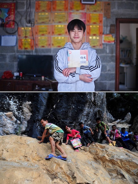 Photo combinée montrant Meng Wenchao, lycéen, posant pour une photo à la maison devant un mur plein de ses certificats de mérite le 26 janvier 2023 (ci-dessus) et Meng Wenchao, 7 ans (1er à gauche) marchant sur le chemin du retour le 5 septembre 2012 (ci-dessous) dans le village de Nonglei du comté autonome Yao de Dahua, dans la région autonome Zhuang du Guangxi (sud de la Chine). (Photo / Xinhua)