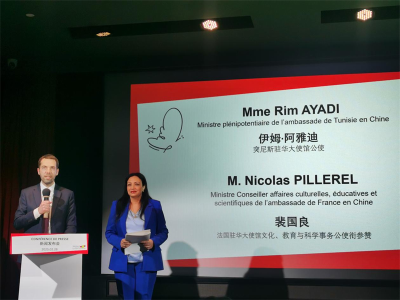 | Nicolas Pillerel (à gauche), ministre conseiller affaires culturelles, éducatives et scientifiques de l'ambassade de France en Chine, et Rim Ayadi (à droite), ministre plénipotentiaire de l'ambassade de Tunisie en Chine, ont annoncé conjointement une série d'activités du Mois de la francophonie de cette année.(Sun Hongyu / le Quotidien du Peuple en ligne) |