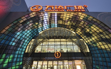 Vue nocturne d'un Wanda Plaza de Dalian Wanda Immobilière Commerciale Co à Shanghai, en Chine, le 28 Juillet 2014
