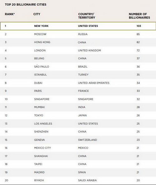 En deuxième position on retrouve Beijing, avec 37 milliardaires combinant un total de biens de 98 milliards de dollars. Plut?t autodidactes et un age moyen de 51 ans, ils ont également plus d’opportunités et de temps pour aider à générer de grosses fortunes.
