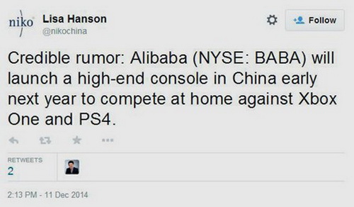 | Un compte Twitter non confirmé du nom de ? Lisa Hanson ? commente la rumeur parlant de la console de jeux d'Alibaba le 11 décembre 2014. |