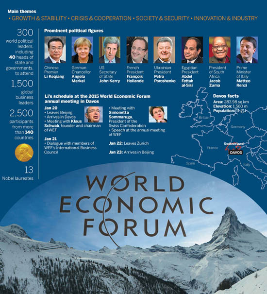 Mardi, sur le départ pour Davos en Suisse, Li Keqiang assistera aux réunions du Forum économique mondial, où les leaders mondiaux s'attendent à ce que le numéro 2 du gouvernement chinoise démontre un engagement actif dans les affaires internationales et une forte détermination pour approfondir les réformes économiques dans uns situation de récession mondiale.