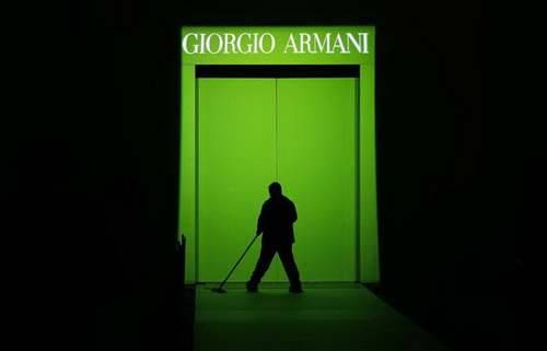 Un employé nettoie le podium avant le défilé de la collection automne/hiver 2014 de Giorgio Armani lors de la Fashion Week de Milan, le 24 février 2014.