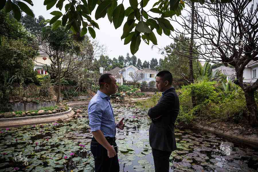 Li Tie, à gauche, et Zheng Chu, à droite, co-fondateurs de l'application Runtu, parlent de leur entreprise à c?té d'un bassin, près de leurs bureaux de Guangzhou, capitale de la Province du Guangdong, en Chine du Sud. Runtu a pour but de mettre en lien les travailleurs migrants qui viennent de la même ville mais travaillent dans le Guangdong. Li Tie fut une une célébrité médiatique et a dit à ses followers sur Sina Weibo, le Twitter chinois, qu'il a quitté son emploi pour ? démarrer une entreprise, gagner de l'argent et vivre une vie heureuse ?. [Photo / qq.com]