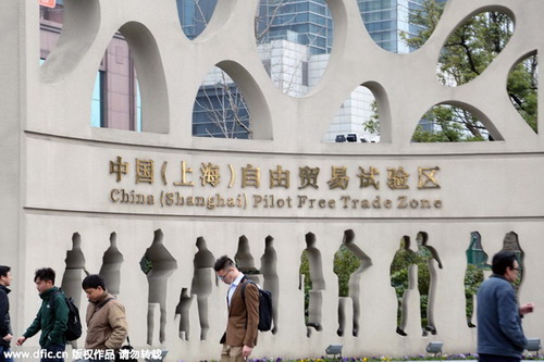 | Des piétons devant le panneau de la zone pilote de libre-échange à Pudong, Shanghai, le 18 mars 2015. [Photo/IC] |