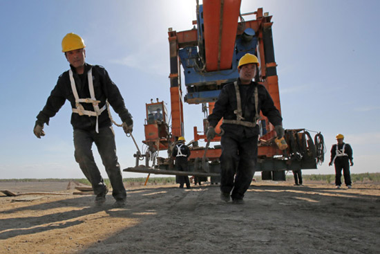 | Des ouvriers préparent la construction d'un pont sur la voie ferrée Ejina-Hami, dans la Région autonome Ou?ghoure du Xinjiang, la semaine dernière. [Photo / China Daily] |