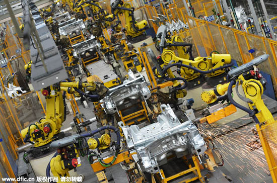 | Des bras de robot soudent des pièces automobiles dans l' usine de voitures de Dongfeng Peugeot Citroen Automobile Co à Wuhan, la province centrale du Hubei, le 24 septembre 2014. [Photo/IC] |