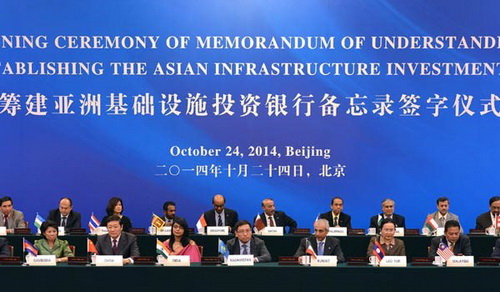 | La cérémonie de signature du protocole d'accord sur l'établissement de la Banque asiatique d'investissement pour les infrastructures, le 24 octobre 2014 à Beijing. [Photo / Xinhua] |