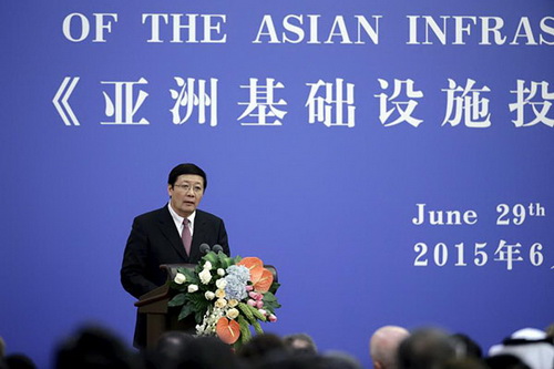 | Intervention du ministre chinois des Finances, Lou Jiwei, lors de la cérémonie de signature du contrat d'engagement de la Banque asiatique d'investissement pour les infrastructures (AIIB), au Grand Palais du Peuple à Beijing, le 29 juin, 2015. Le ministre a déclaré lundi être confiant quant au début des opérations de la Banque asiatique d'investissement pour les infrastructures avant la fin de l'année. [Photo/Agences] |