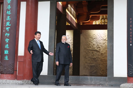 | Le 14 mai 2015, Xi Jingping accompagne Narendra Modi lors d'une visite au Temple de Grande Bonté. (Photo/Lan Hongguang/Xinhua) |
