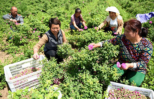 Des agriculteurs récoltent des bourgeons avant de les sécher pour en faire du thé de roses dans la ville de Bozhou, dans la Province de l'Anhui, le 13 mai 2015. [Photo / IC]