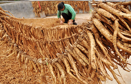 Une agricultrice pend des racines destinées à faire des médicaments chinois pour les faire sécher dans le Comté de Weining, dans la Province du Guizhou, le 26 mars 2015. [Photo / IC]