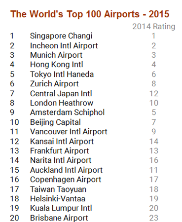 Les World Airport Awards sont décernés depuis 1999, et ils sont devenus une référence mondiale d'excellence des aéroports. Le classement 2015 s'est basé sur 13 millions de questionnaires remplis par les clients des compagnies aériennes à travers le monde. L'enquête a porté sur 550 aéroports dans le monde, et évalué les expériences des voyageurs à l'enregistrement, à l'arrivée, lors des transferts, les achats, la sécurité et les procédures d'immigration jusqu'au départ par les portes.