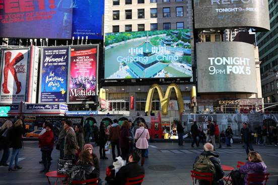 Depuis le 19 octobre, le grand écran de Times Square de New York a commencé la diffusion par roulement de vidéos promotionnelles sur la ville de Guiyang et le Congrès mondial du financement participatif 2015, connu également sous le nom de crowfunding, pour présenter aux citoyens américains et aux touristes du monde entier tout le style de la ville de Guiyang, la capitale chinoise de l'été éternel, mais aussi la ? Vallée des données ? de la Chine et la ville h?te du Congrès mondial sur le crowfunding.