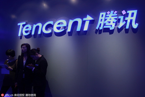 Des employés chinois se tiennent en face d'un logo de Tencent à son siège de la ville de Shenzhen, dans la Province du Guangdong (Sud de la Chine), le 29 mars 2013. [Photo / IC]