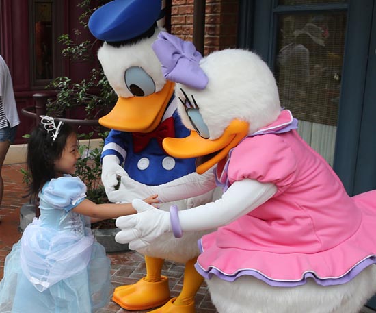 Une fillette rencontre ses héros de cartoon préférés à Shanghai Disneyland.