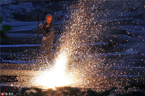 Un ouvrier chinois produit de l'acier dans une usine d'acier de Huai'an, ville de la Province du Jiangsu (Est de la Chine), le 16 ao?t 2015. [Photo / IC]