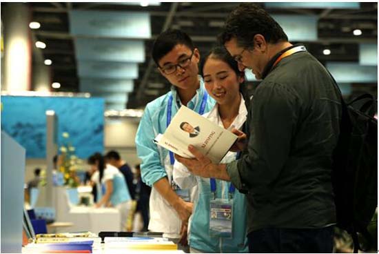 Le Centre de presse du Sommet du G20 de Hangzhou a officiellement ouvert le 1er septembre. La photo montre un représentant de la presse étrangère découvrant, grace à l’aide de volontaires, le livre de Xi Jinping ? La gouvernance de la Chine ?, sur la plateforme d’exposition du Centre de presse. (Jiao Xiang, pour le Quotidien du Peuple)