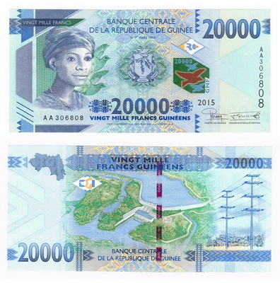 Sur le dos du billet guinéen de 20 000 Francs figure une illustration du barrage hydro-électrique de Kaleta, qui a été construit par une société chinoise et a doublé la capacité énergétique de ce pays africain.