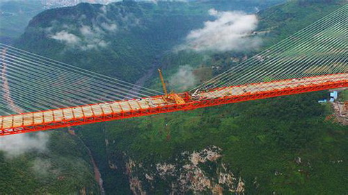 Les travaux visant à relier la partie principale d'un pont, qui se trouve à près de 570 mètres au-dessus d'une vallée, ont été achevés le 10 septembre dans la province du Guizhou, dans le Sud de la Chine. Avec une hauteur équivalente à un immeuble de 200 étages, le pont de Beipanjiang est le plus élevé dans le monde en ce qui concerne la distance verticale entre le tablier du pont et le sol ou la surface de l'eau sous la travée du pont.