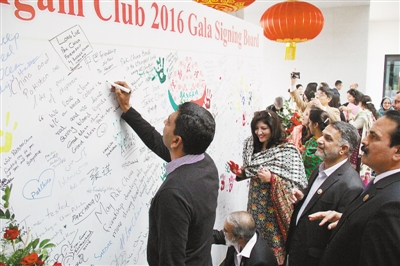 Le 19 novembre 2016, des invités pakistanais assistant à la cérémonie de lancement du forum ? Cultivons profondément l'amitié ? signent et écrivent leurs v?ux sur un panneau réservé aux messages. (Photo : Xu Wei pour le Quotidien du Peuple)