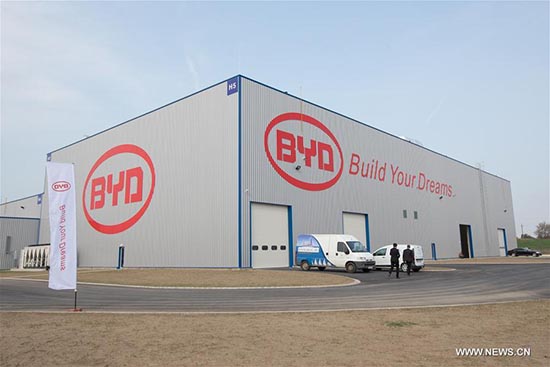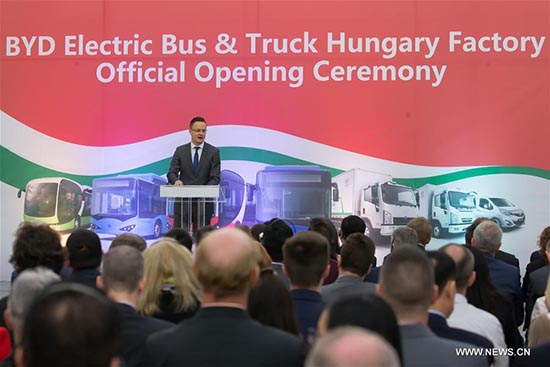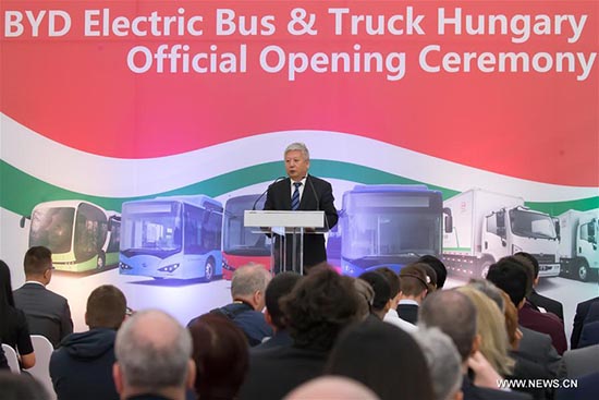 Cérémonie d'inauguration de l'usine de bus électriques de BYD à Komarom, dans le nord de la Hongrie, le 4 avril 2017. Le constructeur automobile chinois BYD a ouvert sa première usine de bus électriques en Europe. La société projette d'investir 20 millions d'euros (21,3 millions de dollars) dans ce projet d'ici 2018.