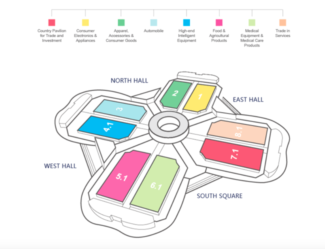 L'Exposition sera composée de deux sections, le commerce de biens et commerce de services. Une première section de 6 zones de 180 000 m2, comprenant les équipements intelligents haut de gamme, l'électronique grand public et appareils électroménagers, des voitures, vêtements, accessoires et biens de consommation, des produits alimentaires et agricoles, ainsi que du matériel médical et produits de soins médicaux.