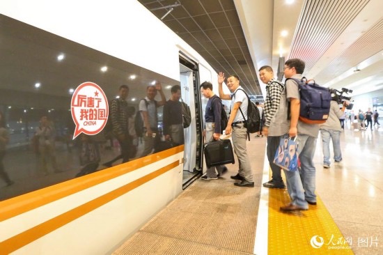 | Des voyageurs étrangers prennent une photo de groupe devant un train ? Fuxing ?. Wang Chu / Le Quotidien du Peuple. |