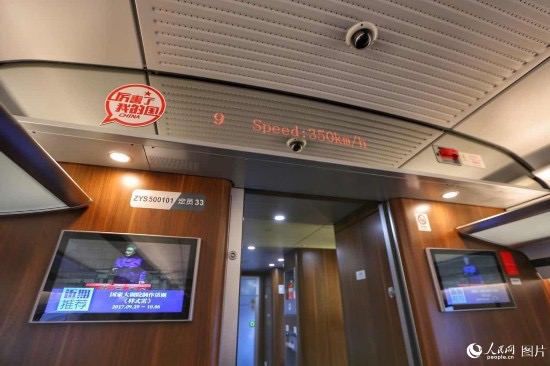 Les passagers peuvent voir la vitesse atteinte par le train ? Fuxing ?sur un écran installé à bord des voitures. Wang Chu / Le Quotidien du Peuple.