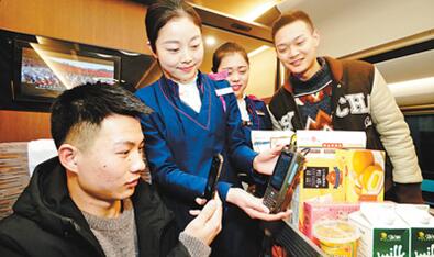 Des passagers scannent le code à deux dimensions pour acheter des marchandises dans un train. Au cours de la Fête du Printemps de cette année, la compagnie de chemins de fer chinoise a lancé un service de paiement mobile sur un plus grand nombre de trains, permettant aux voyageurs de consommer en utilisant diverses méthodes de paiement telles que WeChat et Alipay. Photo prise le 7 février. (Source : le Quotidien du Peuple)