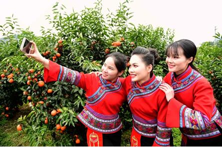 Des enseignantes et cadres du comté autonome Maonan de Huanjiang, dans la région autonome Zhuang du Guangxi entrent dans un verger, et en présentent les fruits à leur cercle d'amis et à des comptes individuels WeChat via un message envoye en ligne. Photo prise le 3 février. (Photo Gao Dongfeng / le Quotidien du Peuple)