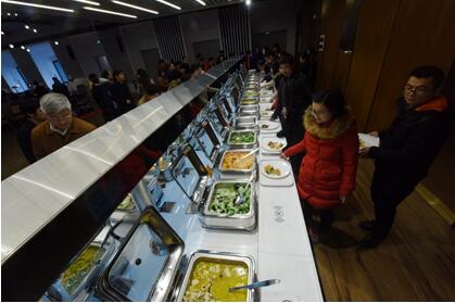 Le 28 février 2018, des clients sélectionnent des plats dans l'espace buffet de l'ancienne cantine de l'Université du Zhejiang. Outre leur identification par la technologie de reconnaissance faciale, le système permet aussi une facturation automatique, et donne des détails sur la facturation, les nutriments et autres informations, envoyées sur le téléphone de l'utilisateur par le biais d'une application WeChat. (Photo Long Wei / le Quotidien du Peuple).
