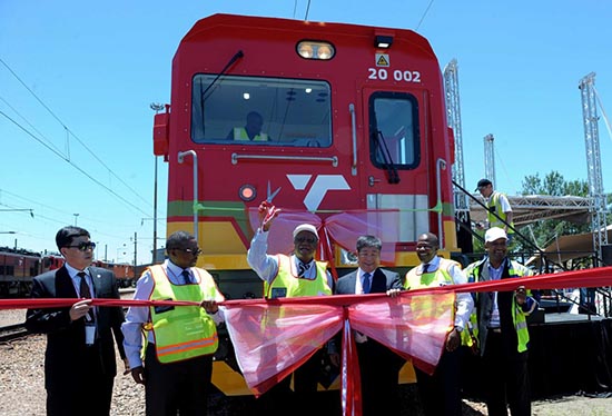 Des membres du personnel applaudissent le lancement de locomotives électriques fabriquées par CRRC Zhuzhou Locomotive Co Ltd à Pretoria, en Afrique du Sud. (Photo / Xinhua)