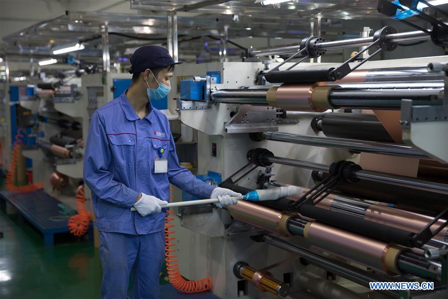 Un ouvrier travaille sur une ligne de production de feuilles de cuivre pour la fabrication de batteries au lithium dans la Société à responsabilité limitée du nouveau matériel Huachuang à Tongling, dans la province chinoise de l'Anhui (est), le 8 ao?t 2018. Le gouvernement de Tongling prend des mesures visant à améliorer l'environnement et à développer l'industrie verte le long du fleuve Yangsté.