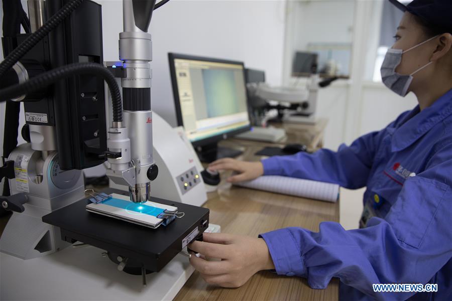 Une employée vérifie une feuille de cuivre destinée à fabriquer une pile au lithium dans la Société à responsabilité limitée du nouveau matériel Huachuang à Tongling, dans la province chinoise de l'Anhui (est), le 8 ao?t 2018. Le gouvernement de Tongling prend des mesures visant à améliorer l'environnement et à développer l'industrie verte le long du fleuve Yangsté.